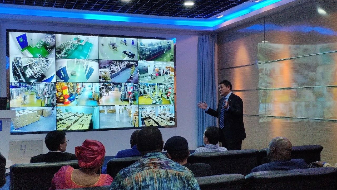 ? ? ? ? 隨后,孔戴總統還觀看了覆蓋廠區各角落、生產全過程的安全監控系統,對全自動生產設備、高科技作業流程表示驚嘆。李杰總裁自豪地介紹,公司所有的高精尖設備,都是中國自主研發的,在非洲兩個工廠的設備也是“中國智造”。孔戴點頭表示贊許,并希望將來能將這些高端的技術、設備和人才引入本國。李杰董事長指著全球戰略地圖上的幾內亞說,希望下次再見總統,這片區域的燈也亮起來了。孔戴發出爽朗的笑聲。參觀結束后,公司領導與孔戴代表團合影留念。? ?